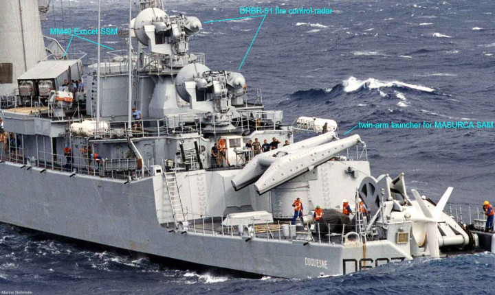 1967年10月服役的絮弗伦级驱逐舰,装备了一座备弹48枚的马祖卡防空系统,双臂式发射架配合55公里最大射程、3马赫最大速度的防空导弹,马祖卡防空系统的综合效能还不错。科尔贝特号巡洋舰在1970年接受现代化改装时,也增设了一套马祖卡防空系统。
